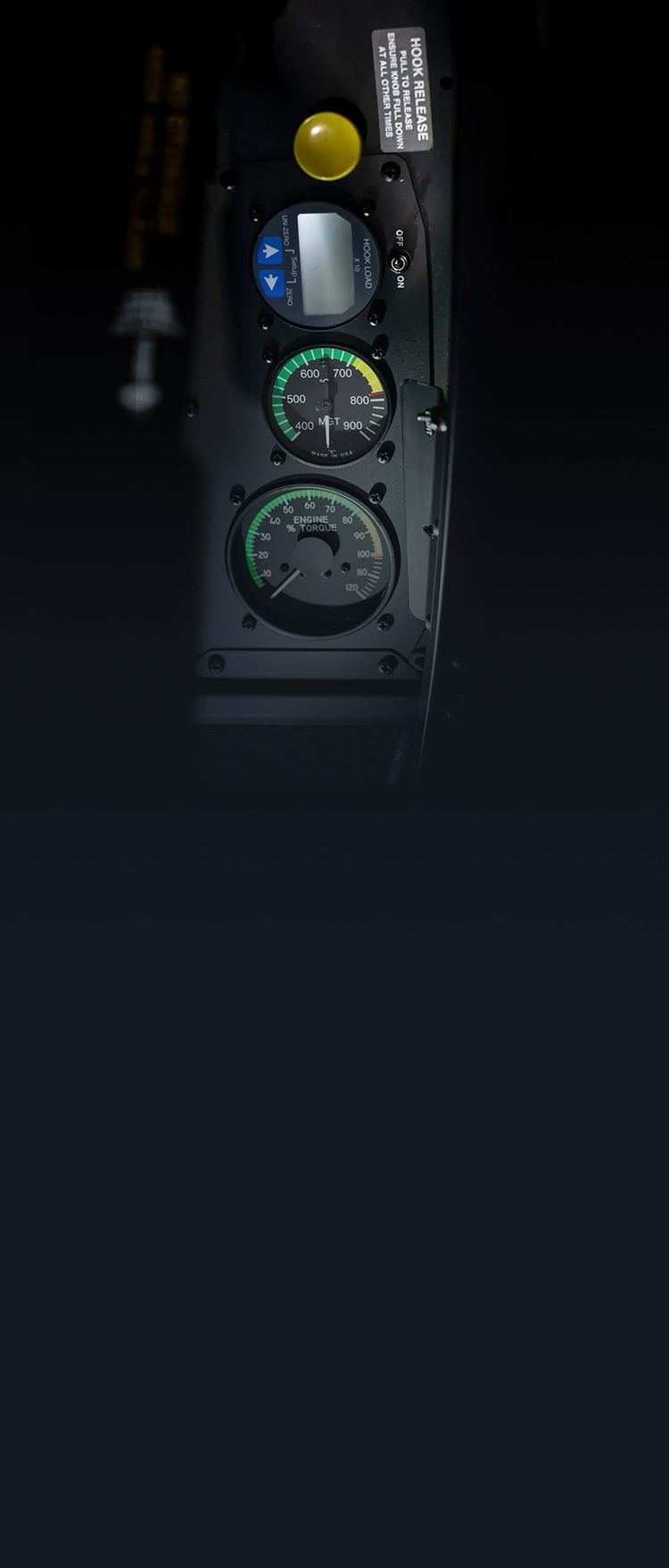 Safety and monitoring for lift operations are prioritized with unique instrumentation, including supplemental engine torque and gas temperature gages along with a hook-load meter located in the sill of the left door, enabling the pilot to monitor critical engine parameters while observing the lift operation.